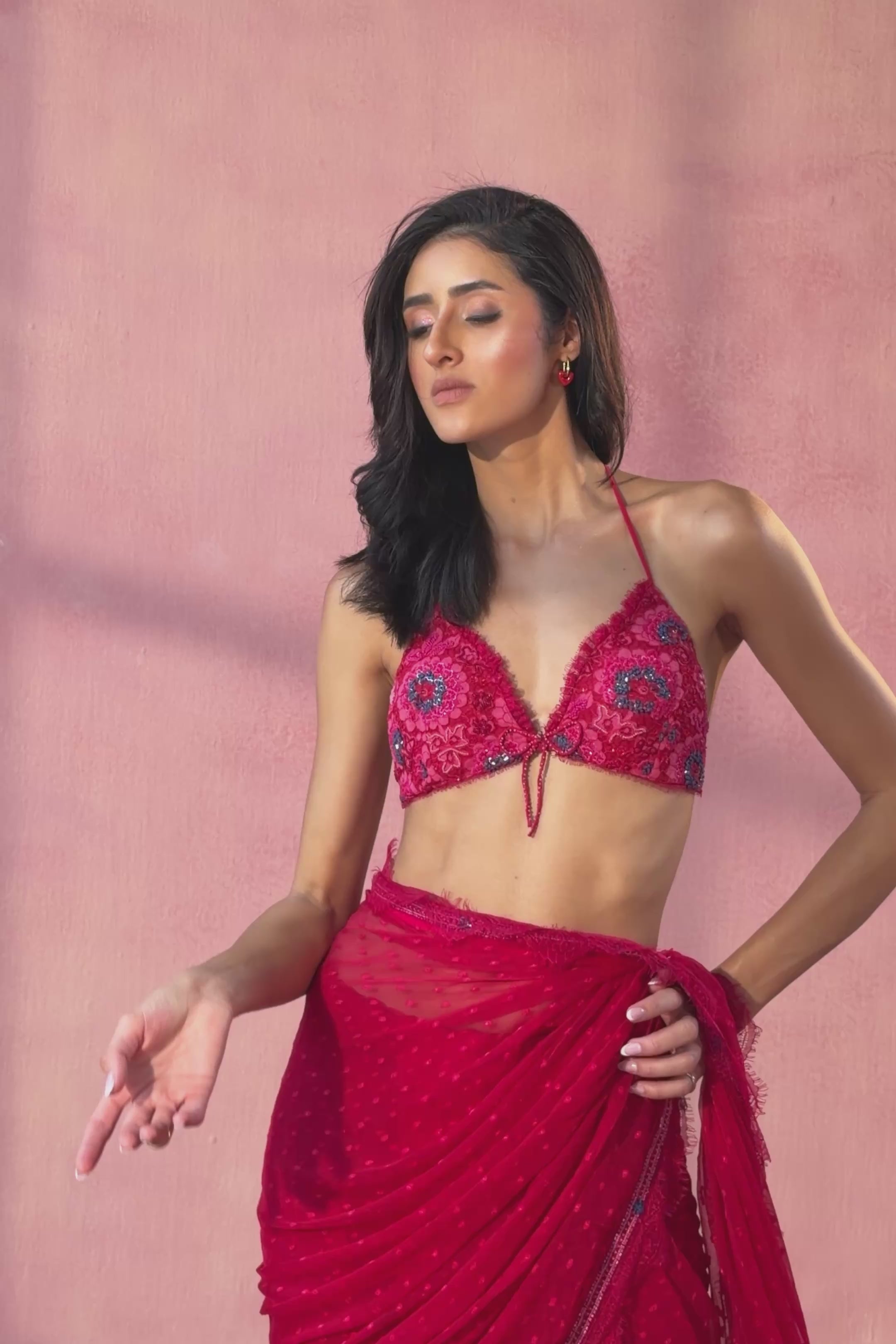 Pair with statement earrings and a bold lip, keeping the rest minimal to let the vibrant hue and intricate blouse stand out.